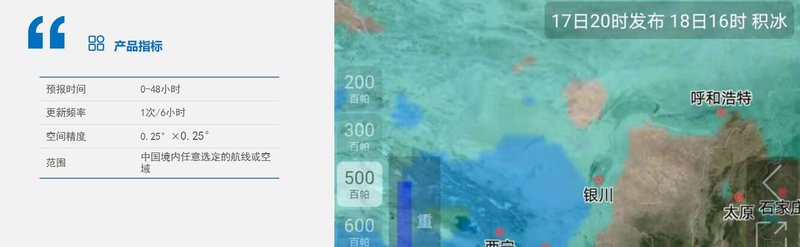 为航空客户定制开发的行业专业产品,可通过平台显示选定航线或区域发生积冰概率的专业预测产品,是保障飞行器安全的重要气象参考要素。